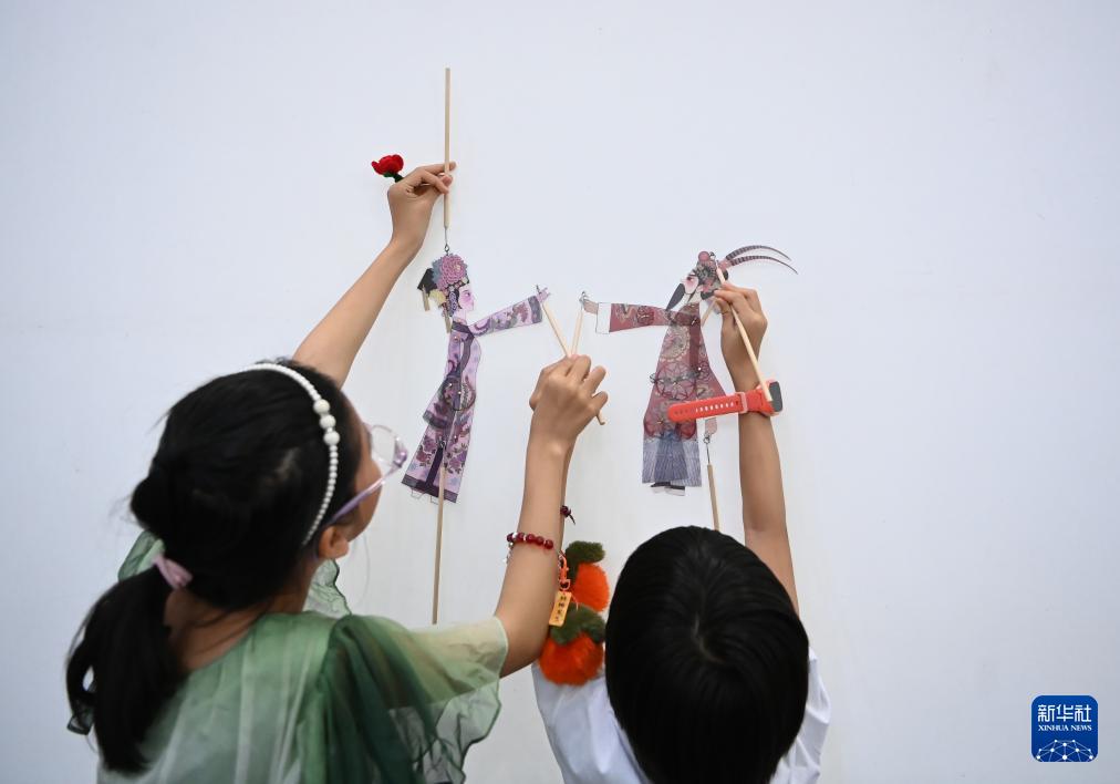 9月14日,在北京市殘疾人聯合會展臺,兩名小朋友在體驗京西皮影戲。