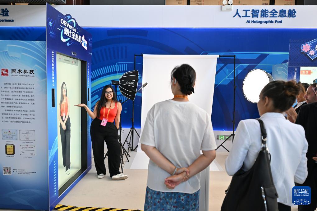 9月14日,一名外國記者在服貿會新聞中心內體驗人工智能全息艙。