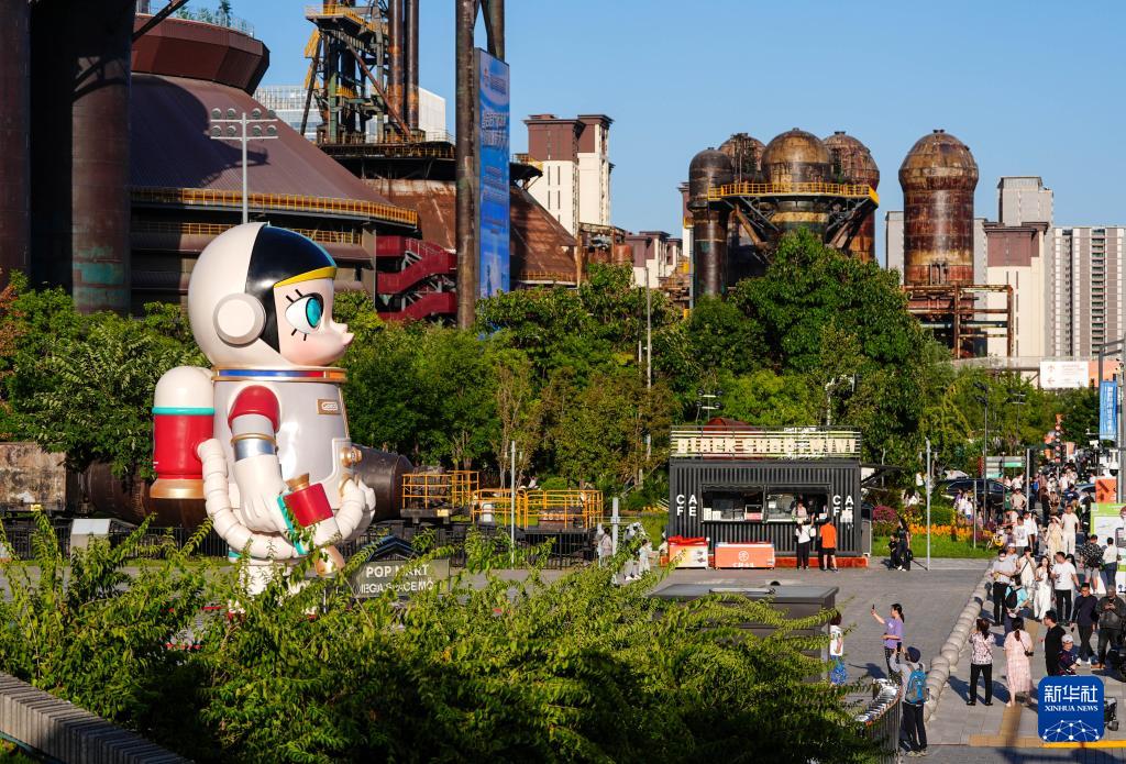 9月14日,人們在北京首鋼園區三高爐前的泡泡瑪特主題雕塑前駐足拍攝。