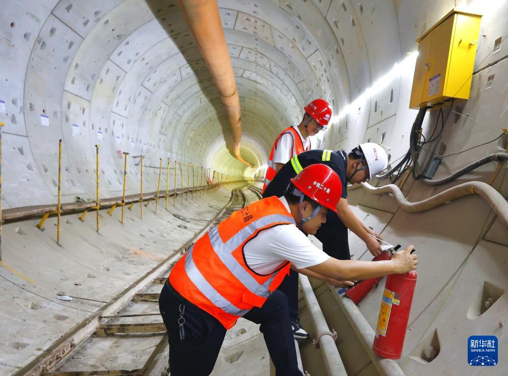 安全監理人員在深圳地鐵16號線共建管廊檢查施工現場的消防設施(9月16日攝)。