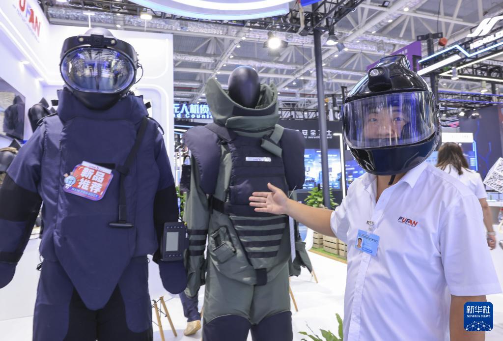 9月16日,在第二屆公共安全科技裝備展現場,工作人員介紹新款排爆服。