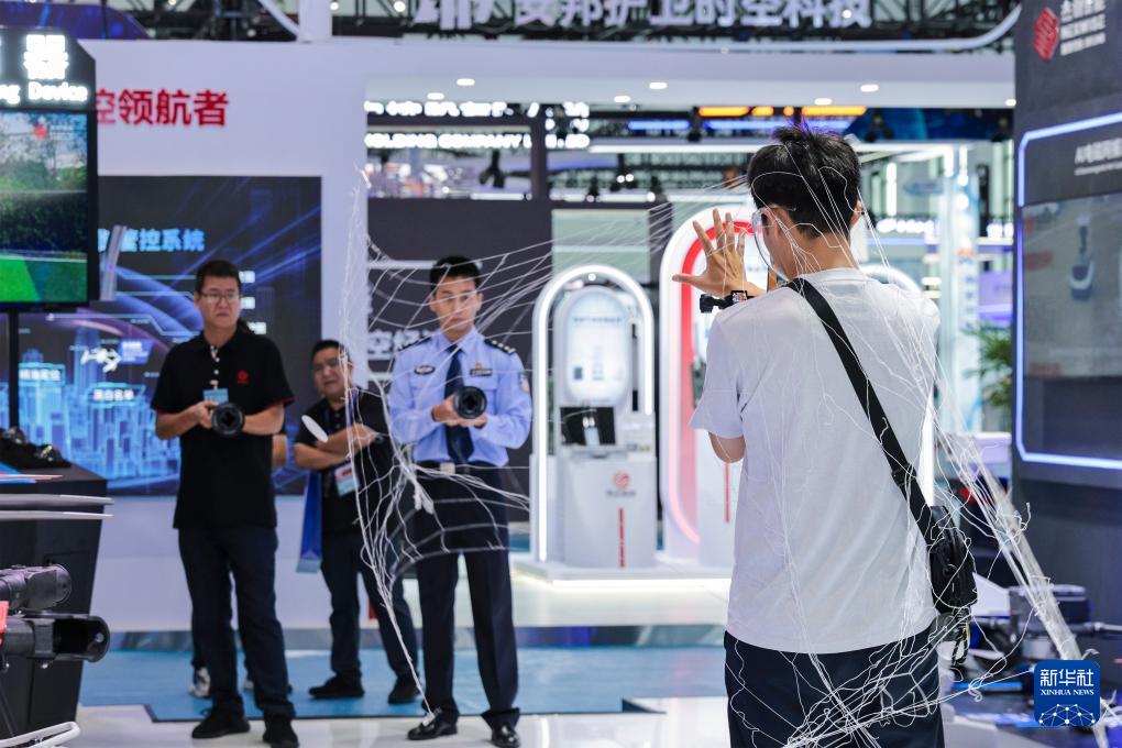 9月16日,在第二屆公共安全科技裝備展現場,工作人員在展示AI電磁網捕產品。