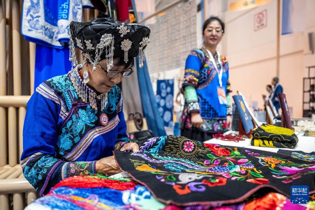 9月17日,國家級(jí)非物質(zhì)文化遺產(chǎn)彝族(撒尼)刺繡省級(jí)代表性傳承人游定美在創(chuàng)意云南文化產(chǎn)業(yè)博覽會(huì)上刺繡。