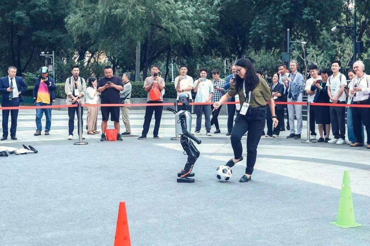 與加速進化TI機器人來一場1V1足球對抗賽,引導機器狗躲避路障走出S形線路,一次次與機器人揮手致意親密接觸,眼神里閃爍著好奇與驚嘆……