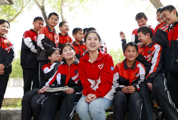 在新疆阿圖什市哈拉峻鄉(xiāng)謝依特小學(xué),支教教師高淑賢和學(xué)生們?cè)谝黄穑?025年4月23日攝)。新華社記者 王菲 攝
