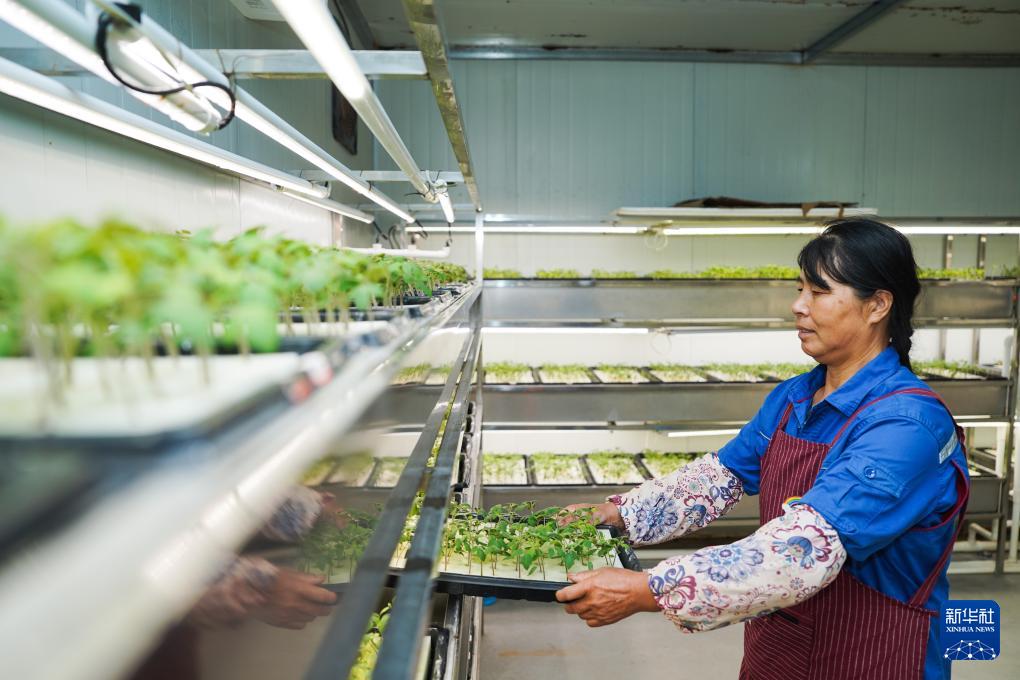 9月18日,工作人員在育苗室內(nèi)取出西紅柿苗(無人機照片)。