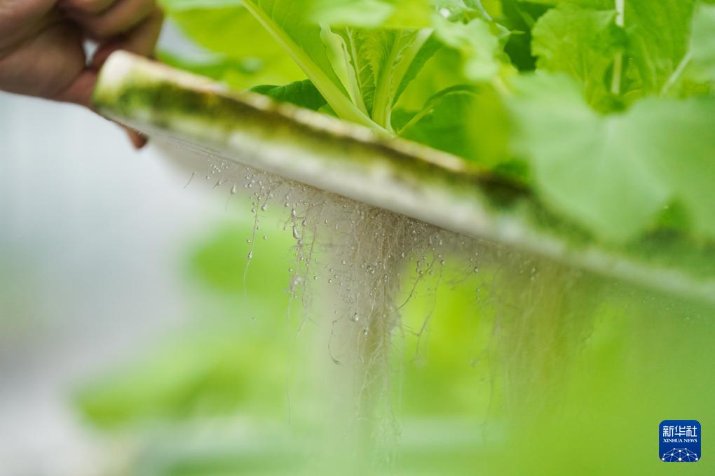 這是9月18日拍攝的使用氣霧栽培技術(shù)生長的奶白菜根系。