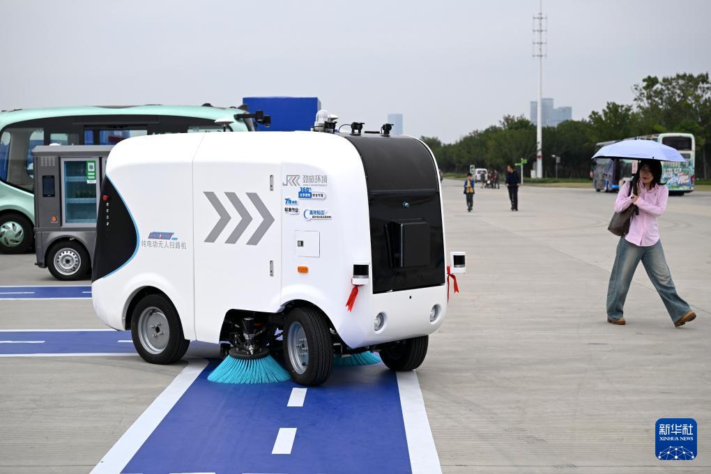 9月21日,觀眾在“全空間無人體系成果展”上參觀一款純電動無人掃路機。