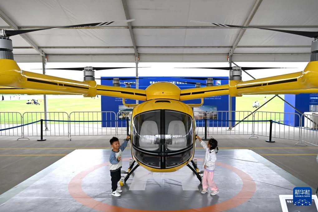 9月21日,小朋友在“全空間無人體系成果展”上參觀一款無人駕駛電動垂直起降航空器。