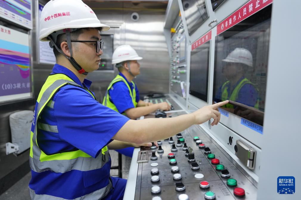 9月22日,中鐵十四局技術人員在甬舟鐵路金塘海底隧道“甬舟號”盾構機內關注設備運行情況。