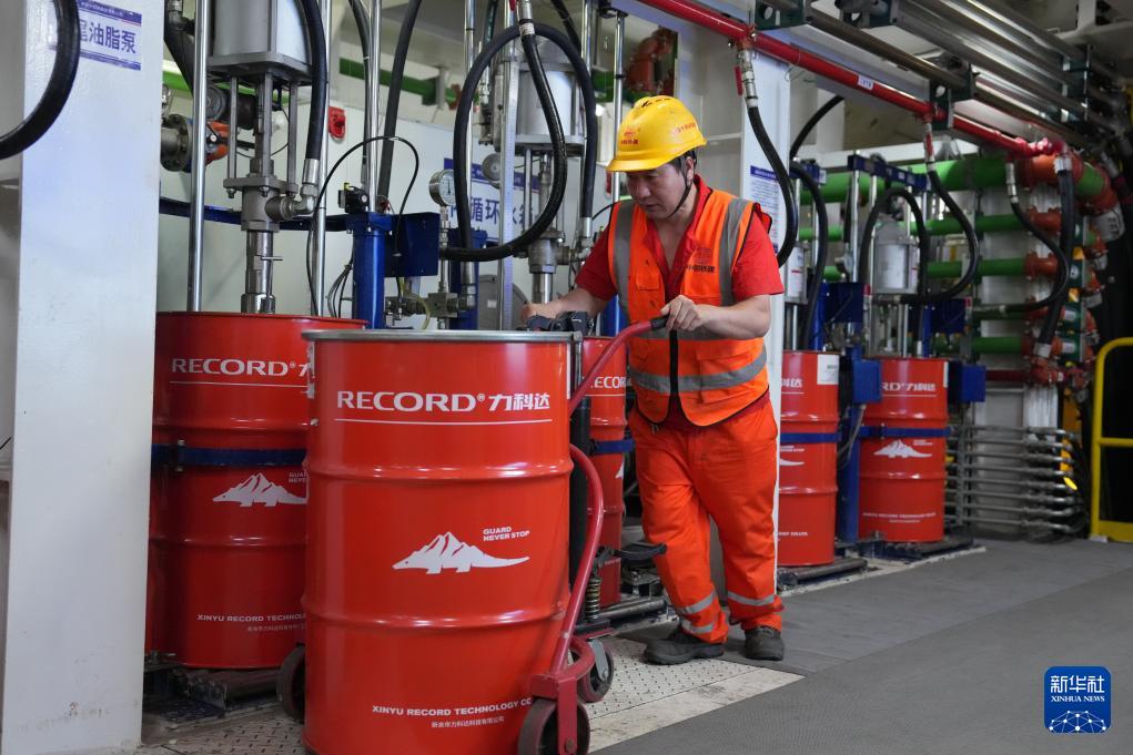 9月22日,中鐵十四局施工人員在甬舟鐵路金塘海底隧道“甬舟號”盾構機內進行盾尾油脂更換作業。
