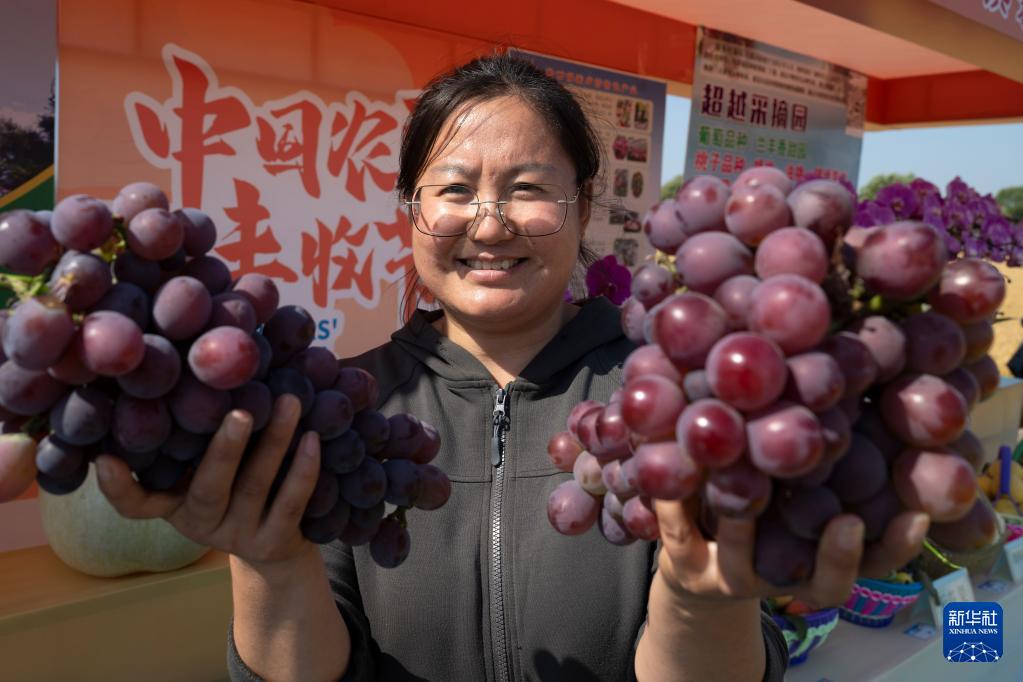 9月23日,農戶在定制農業集中展銷區展示豐收的葡萄。