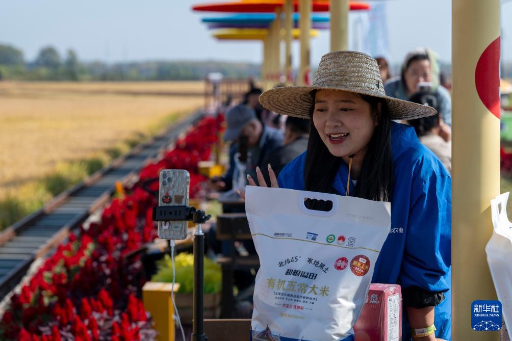 9月23日,網絡主播在北大荒農墾集團閆家崗農場稻田藝術公園內直播。