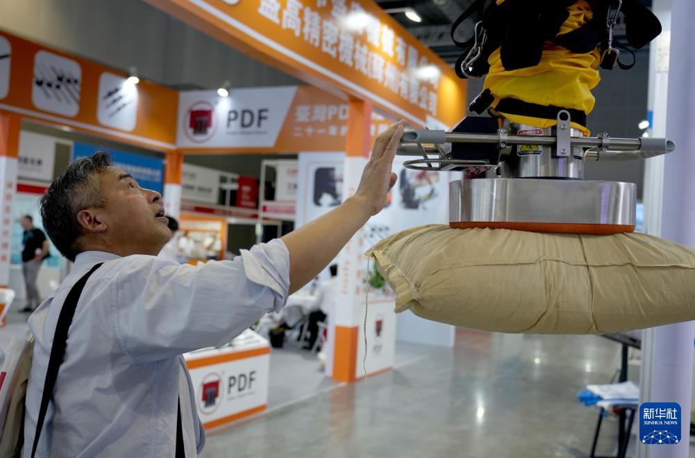 9月23日,參觀者在一個重物搬運輔助設備旁駐足觀看。