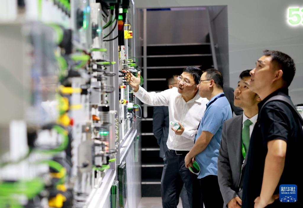 9月23日,參觀者在一組工業自動化設備元件綜合展示墻前交流討論。
