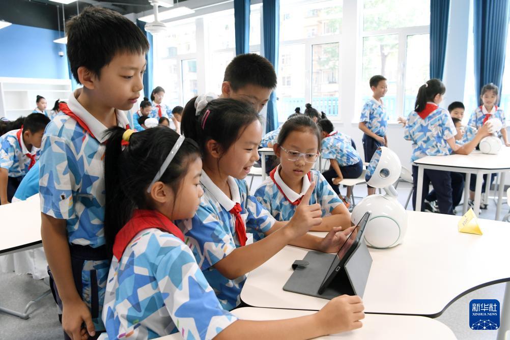 9月24日,北京市第二十中學附屬育鷹小學學生在人工智能教育通識課《從國防到生活——AI人臉識別》了解人臉識別技術。