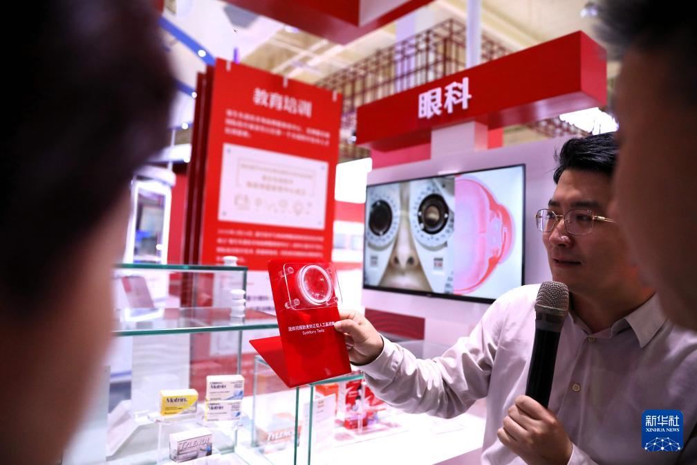 9月24日,工作人員為參觀者介紹“連續視程散光矯正型人工晶狀體”。