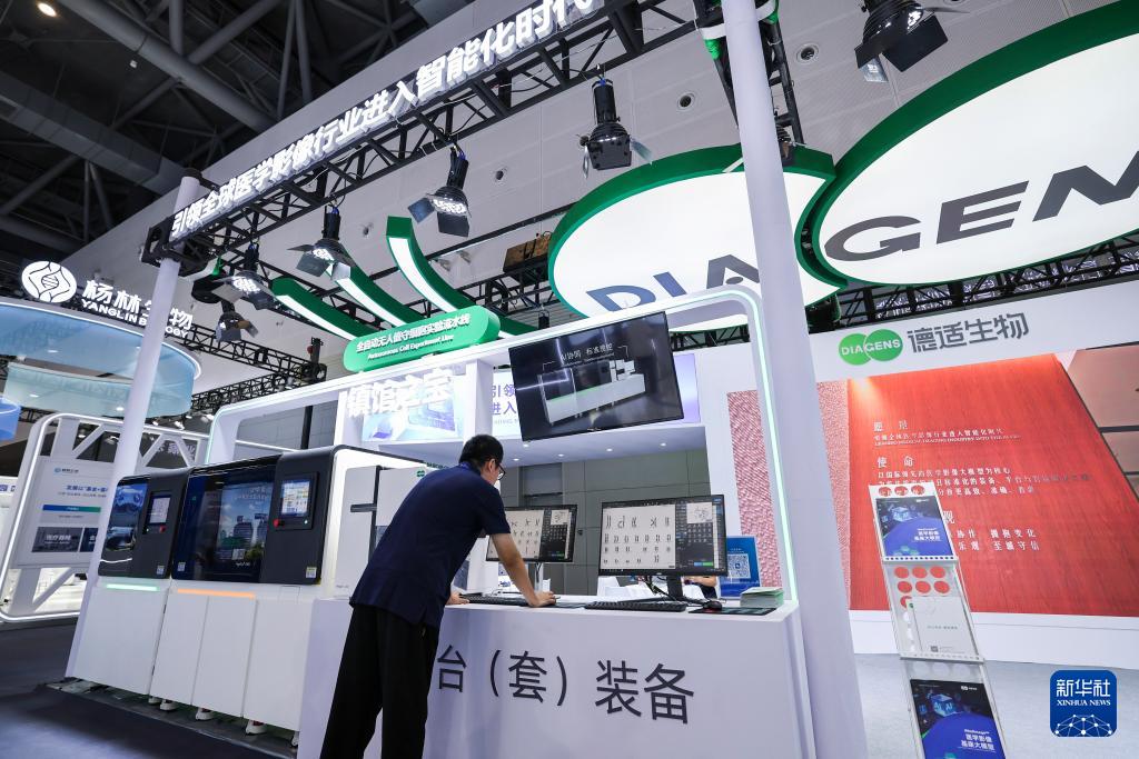 這是9月25日在第四屆全球數(shù)字貿(mào)易博覽會(huì)數(shù)字醫(yī)療展區(qū)拍攝的德適生物自主研發(fā)的“全自動(dòng)無人值守細(xì)胞實(shí)驗(yàn)流水線”。