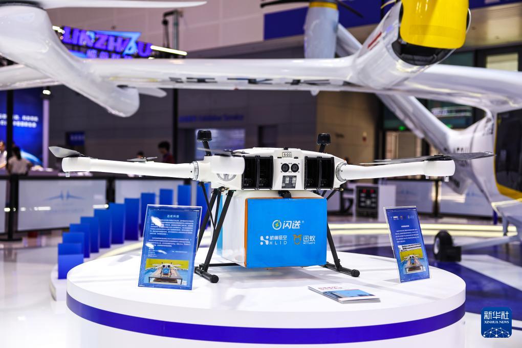 這是9月25日在第四屆全球數(shù)字貿(mào)易博覽會(huì)數(shù)智出行展區(qū)拍攝的快遞無人機(jī)。