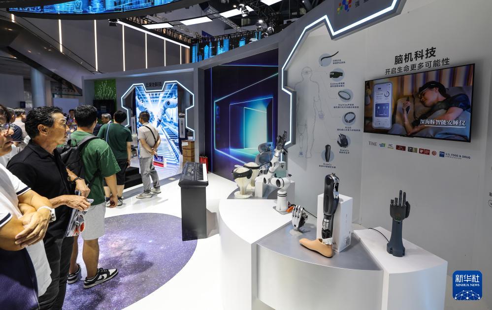9月25日,在第四屆全球數(shù)字貿(mào)易博覽會(huì)的數(shù)智未來主題展區(qū)的杭州六小龍專區(qū),觀眾在觀看強(qiáng)腦科技的仿生靈巧手。