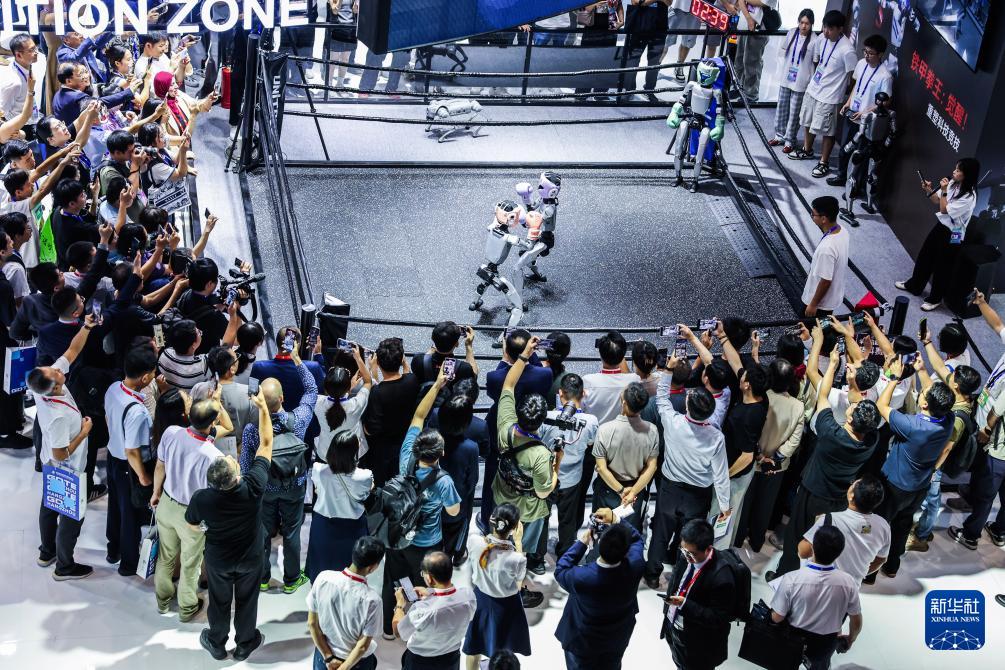 9月25日,在第四屆全球數(shù)字貿(mào)易博覽會(huì)數(shù)智未來主題展區(qū)的杭州六小龍專區(qū),觀眾觀看宇樹科技的人形機(jī)器人進(jìn)行格斗擂臺(tái)賽。