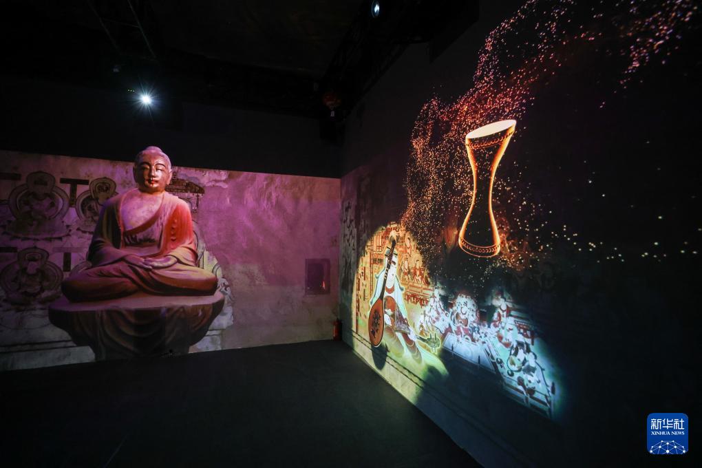 這是9月25日拍攝的第四屆全球數(shù)字貿(mào)易博覽會(huì)數(shù)字文娛展區(qū)內(nèi)的洞窟沉浸式展廳,該展廳是浙江音樂學(xué)院與敦煌文旅集團(tuán)利用AI技術(shù)聯(lián)合打造的敦煌石窟互動(dòng)音樂特展。