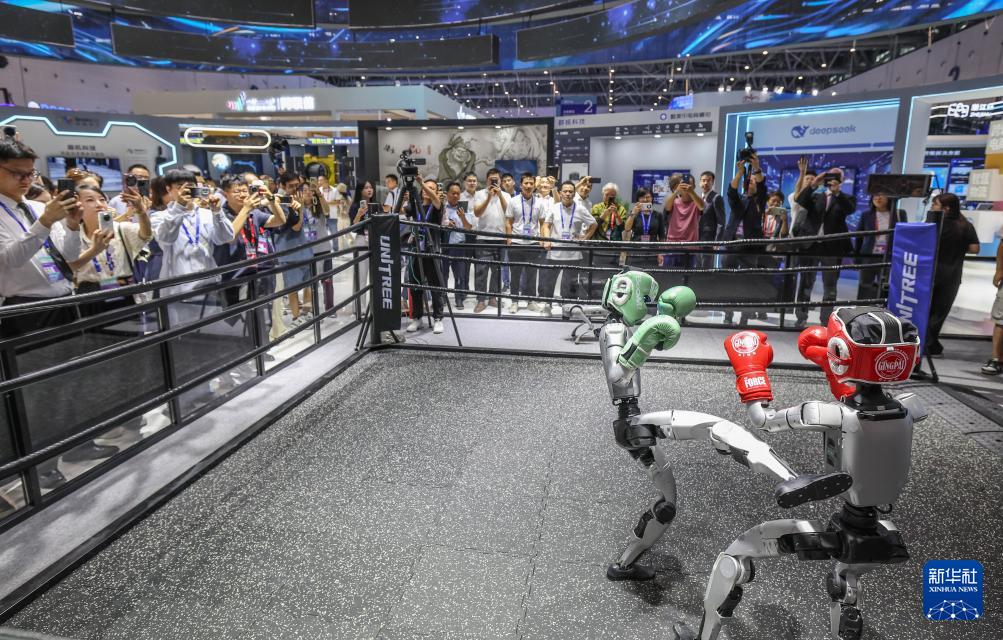 9月25日,在第四屆全球數(shù)字貿(mào)易博覽會(huì)數(shù)智未來主題展區(qū)的杭州六小龍專區(qū),宇樹科技的人形機(jī)器人在進(jìn)行格斗擂臺(tái)賽。