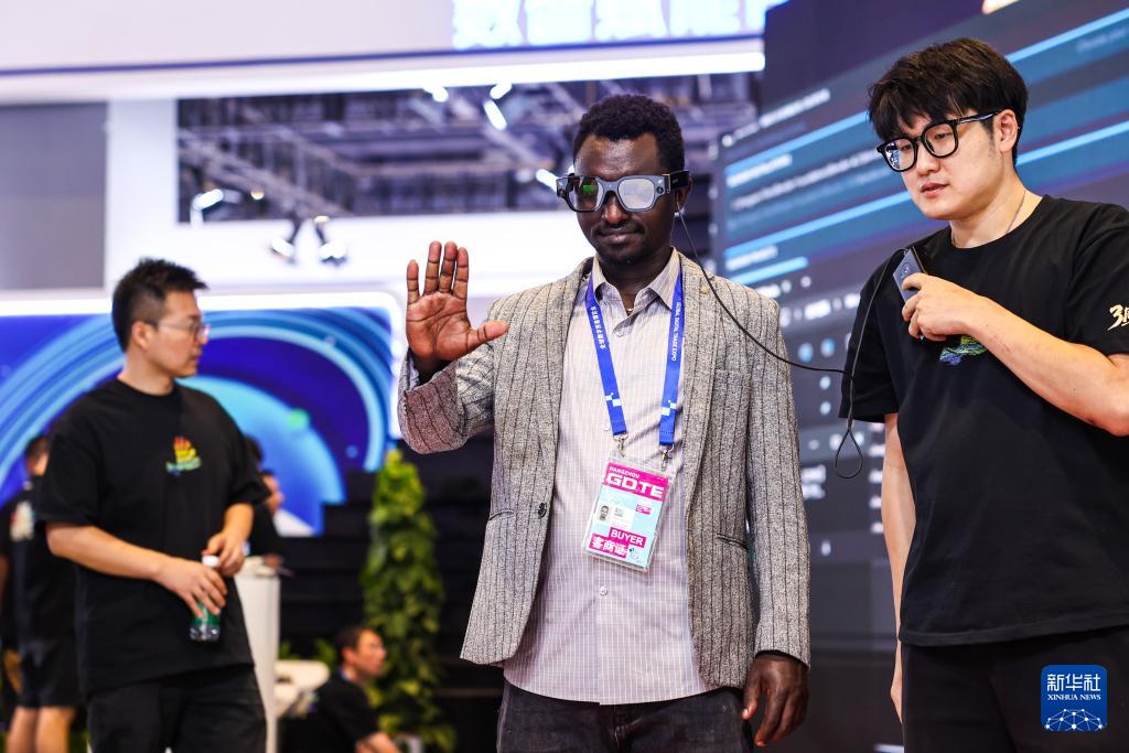 9月25日,外籍客商(右二)在第四屆全球數(shù)字貿(mào)易博覽會(huì)人工智能展區(qū)體驗(yàn)智能眼鏡設(shè)備。