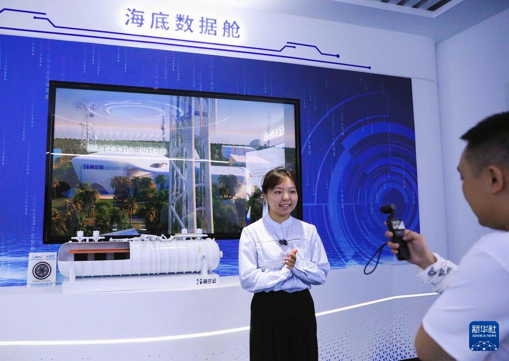 9月25日,一名記者在介紹海南海底數據中心的海底數據艙模型。