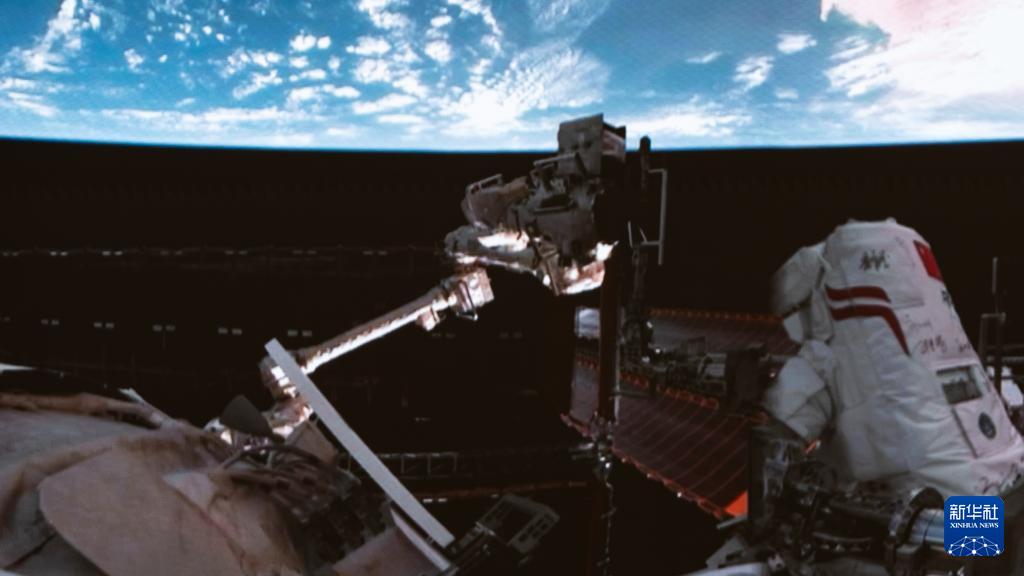 這是9月25日晚在北京航天飛行控制中心屏幕上拍攝的神舟二十號(hào)乘組航天員王杰在空間站組合體艙外作業(yè)的畫(huà)面。