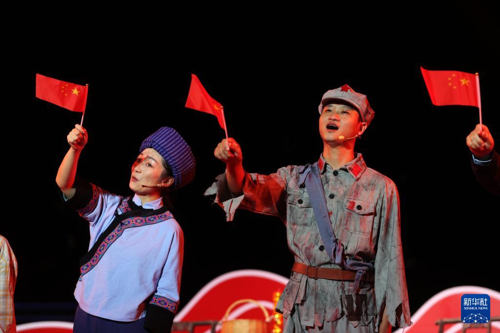 10月1日,演員在重慶市黔江區(qū)武陵水岸表演紅色情景劇《守望》。