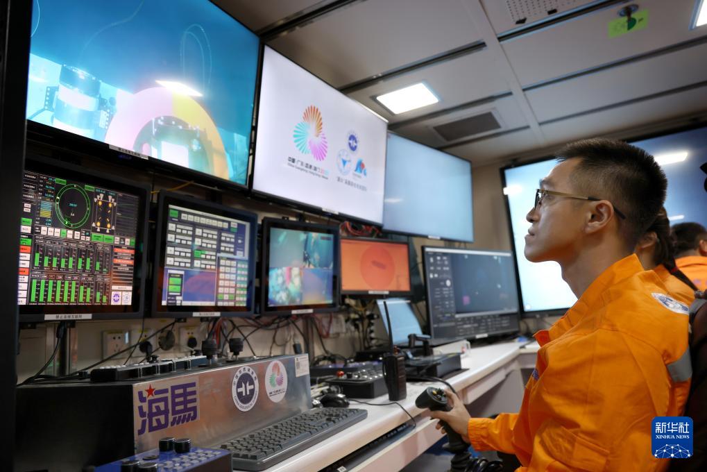 在科考船上的“海馬”號(hào)深海遙控潛水器控制室里,工作人員遙控采火裝置在海底進(jìn)行作業(yè)(9月18日攝)。