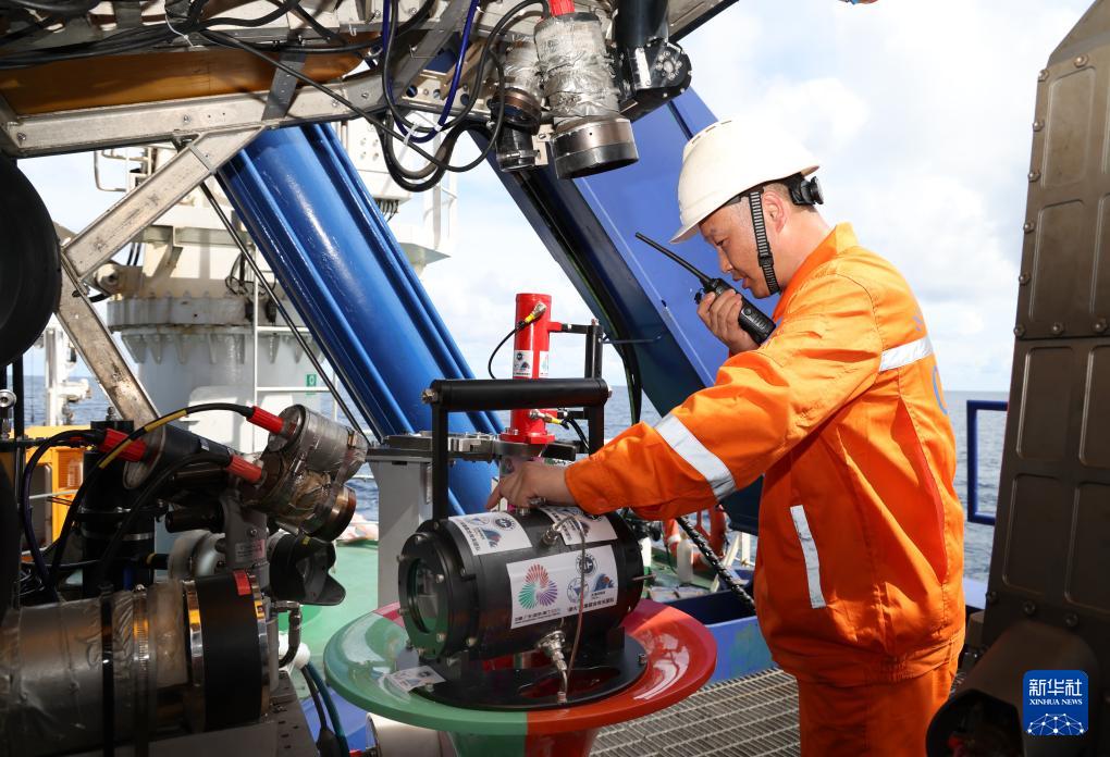 下水采集“源火”前,工作人員在調(diào)整搭載在“海馬”號(hào)深海遙控潛水器上的采火裝置(9月18日攝)。