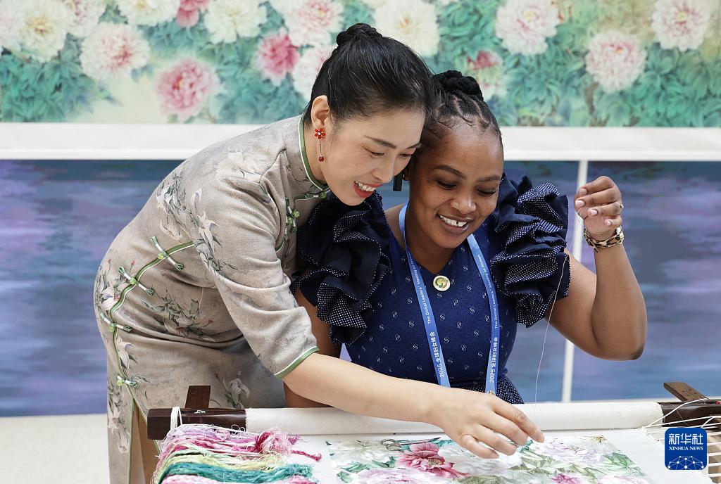 10月14日,來自博茨瓦納的嘉賓在展覽上體驗中國刺繡。