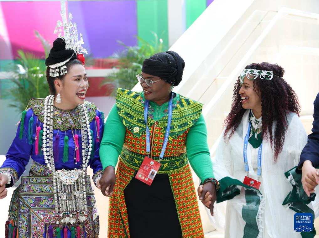 10月14日,來自坦桑尼亞和埃塞俄比亞的嘉賓在展覽現場上與侗族大歌表演者們一起載歌載舞。