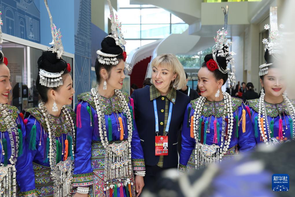 10月14日,來自白俄羅斯的嘉賓在展覽現場與侗族大歌表演者們交流。