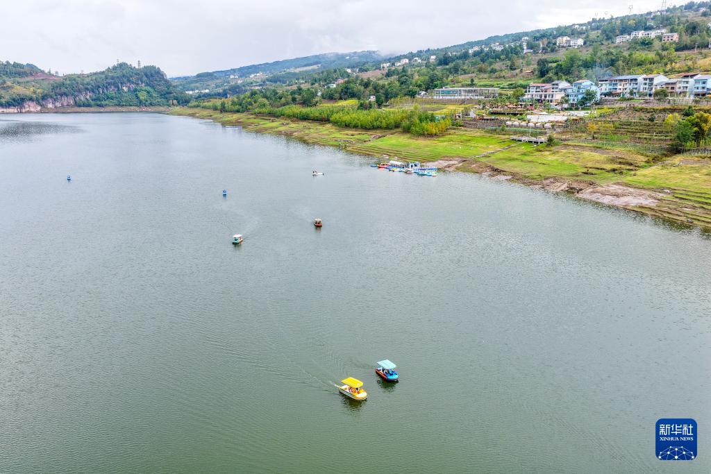 10月15日,游客在濕地公園湖上乘船游玩(無人機照片)。