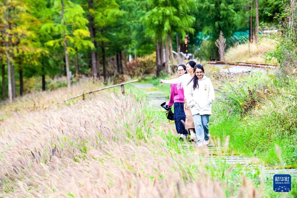 10月15日,游客在濕地公園湖畔步道上游玩。