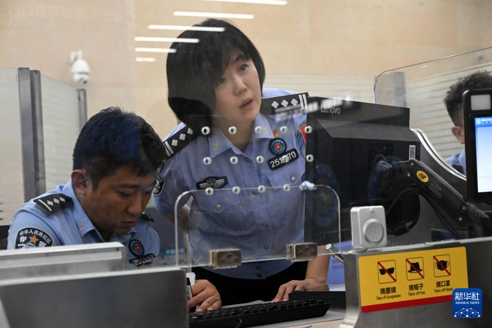 10月14日,移民管理警察曹銳(右)在驗證臺幫助一線民警核驗護照。