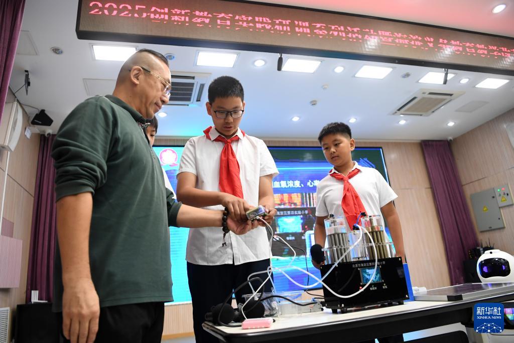 10月15日,在北京市海淀區(qū)第四實(shí)驗(yàn)小學(xué),人工智能社團(tuán)的學(xué)生用其制作的“極客氫氧太陽(yáng)能保健機(jī)”為現(xiàn)場(chǎng)嘉賓進(jìn)行健康監(jiān)測(cè)。