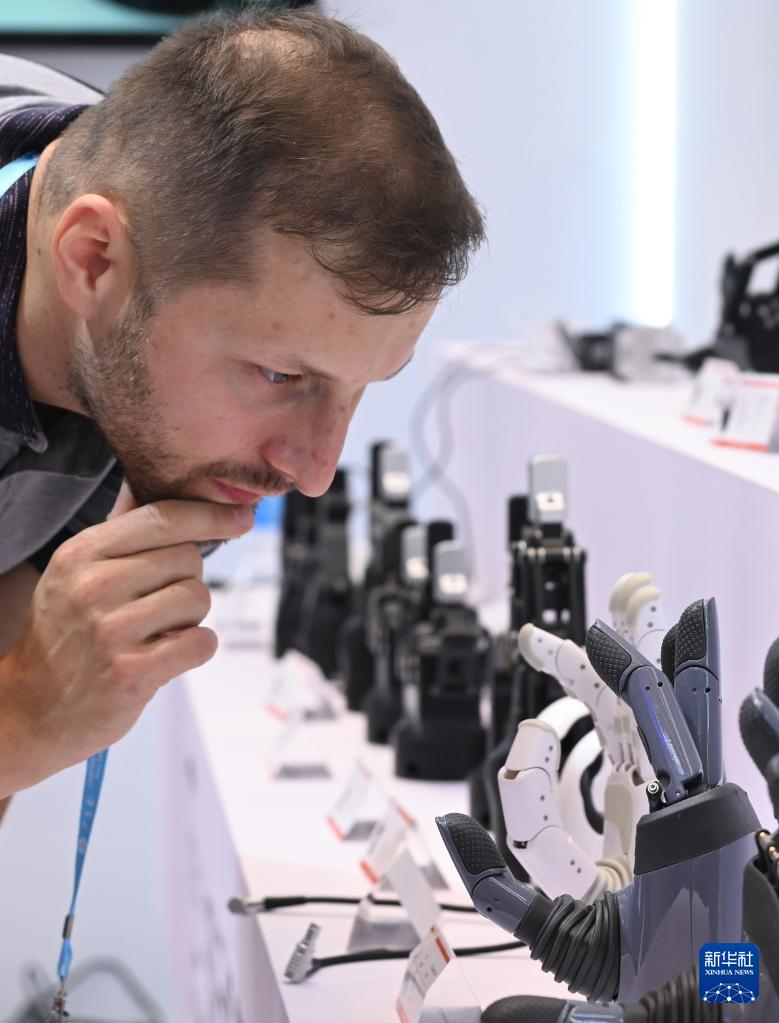 10月15日,境外采購(gòu)商在第138屆廣交會(huì)服務(wù)機(jī)器人專區(qū)體驗(yàn)機(jī)器手同步動(dòng)作。