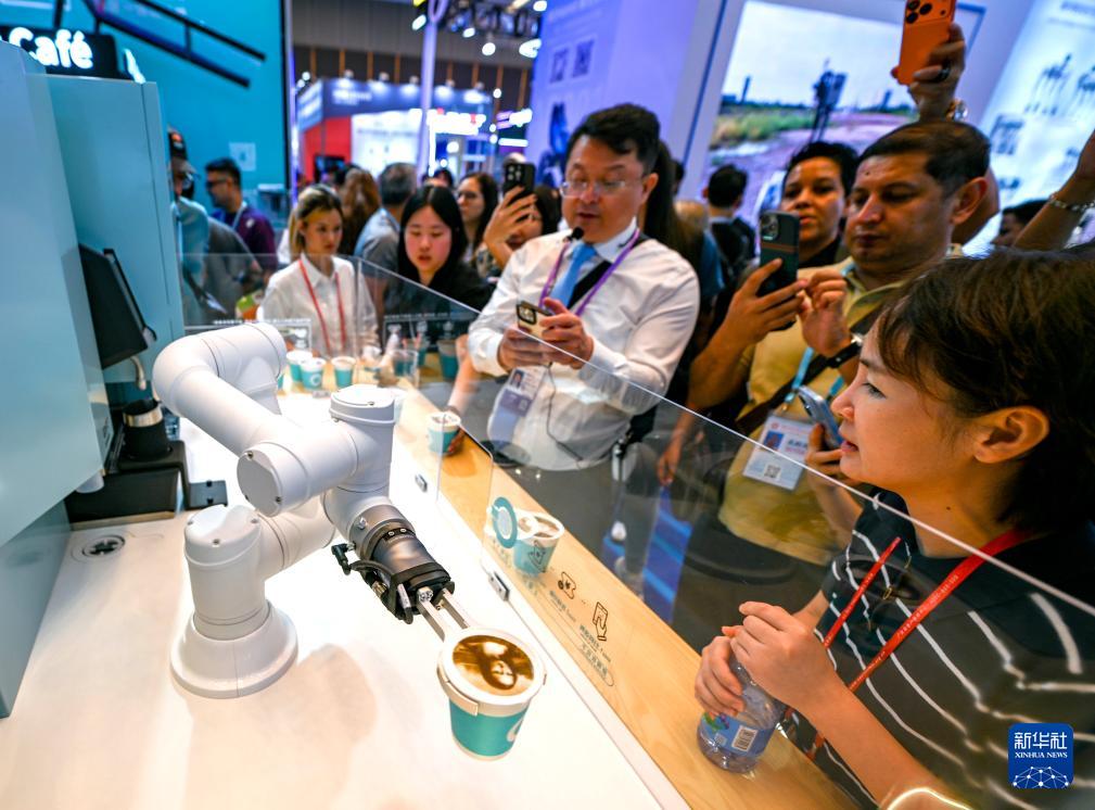 10月15日,在第138屆廣交會(huì)服務(wù)機(jī)器人專區(qū),展商向觀眾展示一款商用咖啡機(jī)器人設(shè)備。