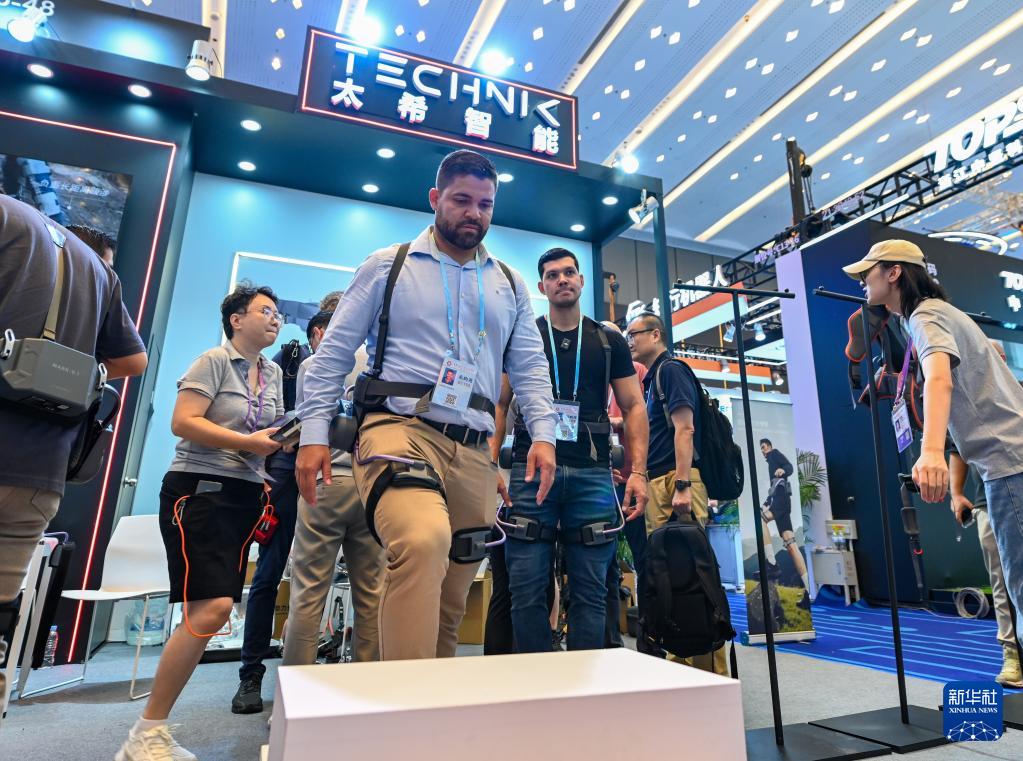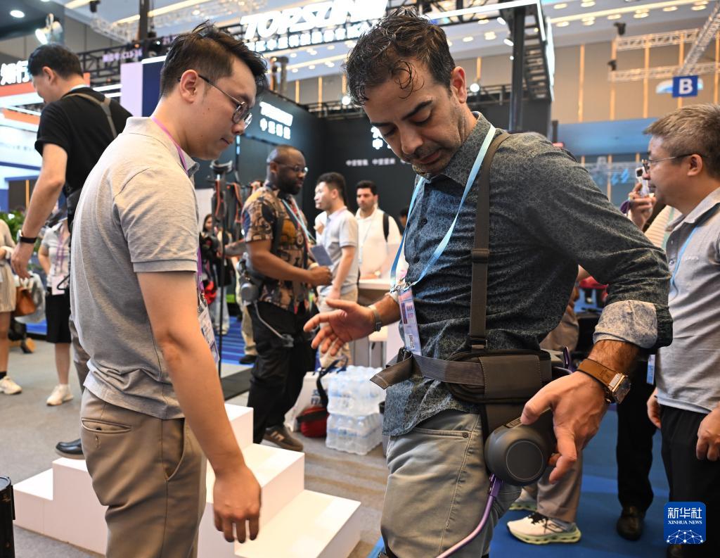 10月15日,境外采購(gòu)商在第138屆廣交會(huì)服務(wù)機(jī)器人專區(qū)太希智能展臺(tái)體驗(yàn)登山助行外骨骼穿戴設(shè)備。