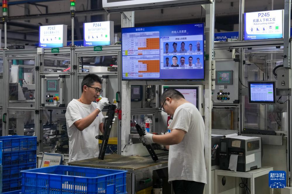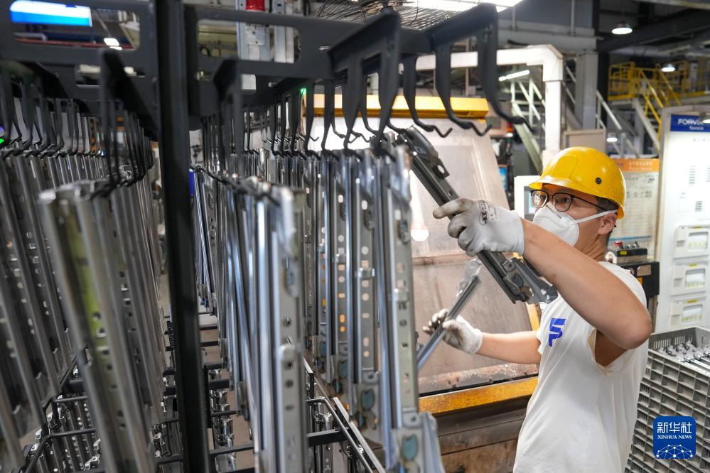 工人在佛吉亞(鹽城)汽車部件系統有限公司汽車配件生產車間內工作(9月18日攝)。