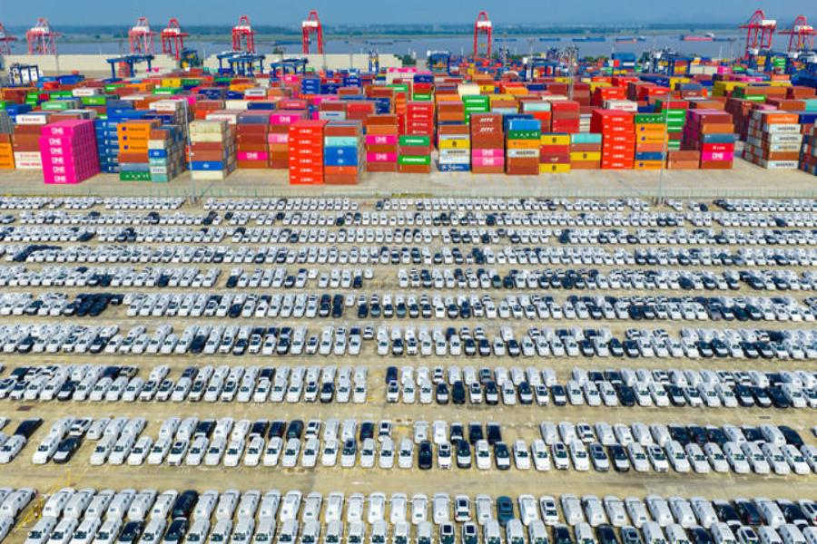 2025年10月4日在江蘇省港口集團南京港龍潭港區拍攝的準備裝船出口的汽車(無人機照片)。新華社發(楊素平攝)