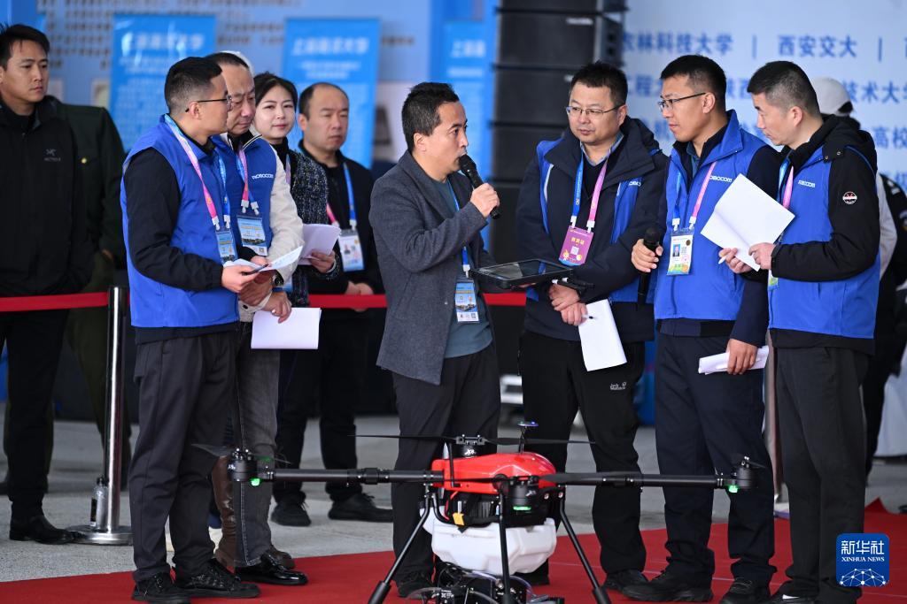 10月26日,在第32屆楊凌農高會的農業機器人比賽上,陜西華基楓林科技有限公司的技術人員(前中)向評委介紹參賽的農用無人機產品。