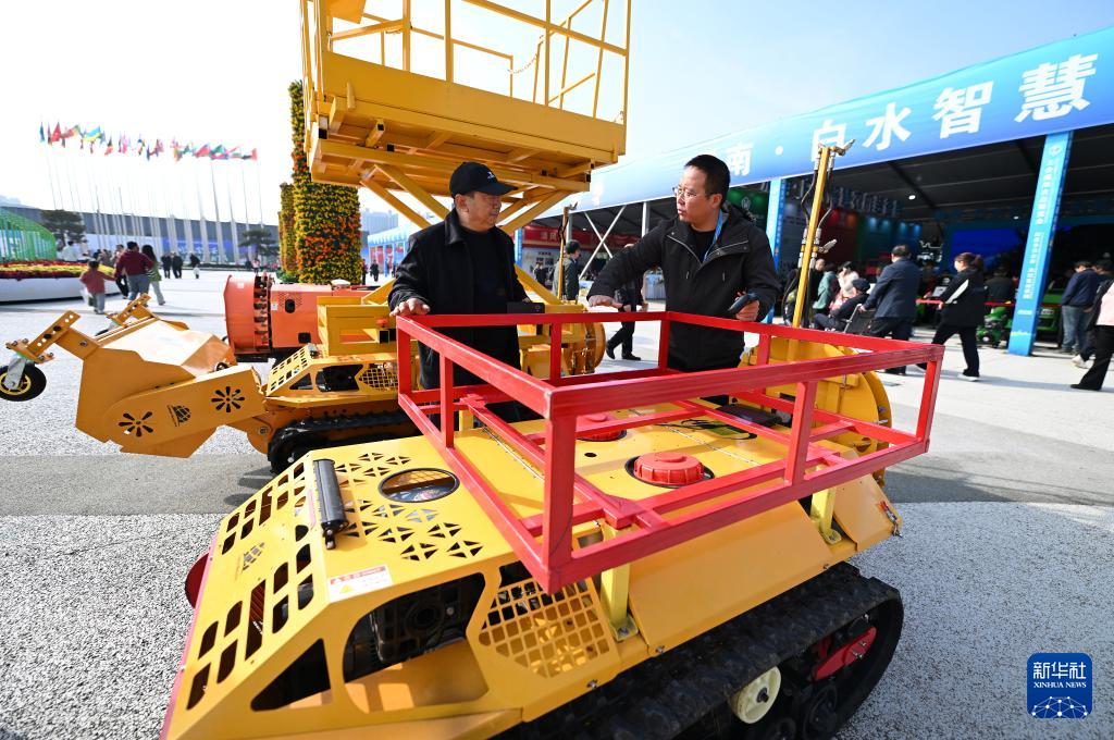10月26日,參觀者在第32屆楊凌農高會上了解渭南君創飛科技有限公司的履帶果園管理機。