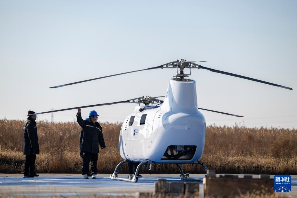 10月30日,在哈爾濱市平房區的哈爾濱聯合飛機科技有限公司,工作人員在T1400無人直升機降落后檢查。