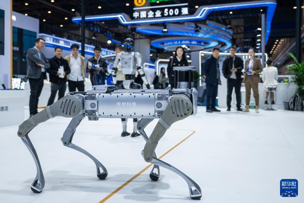 10月31日,觀眾在博覽會現(xiàn)場參觀宇樹科技的智能機器狗。
