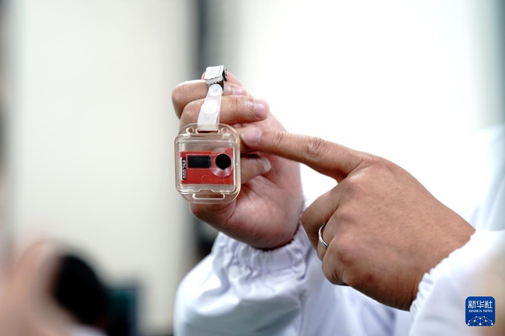 10月24日,在中國科學(xué)院上海應(yīng)用物理研究所武威園區(qū),一位工作人員在佩戴“熱釋光個人劑量計”,該儀器可隨時測量輻射的個人計量當量以確保安全。